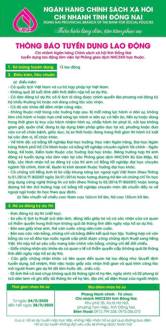 Chi nhánh Ngân hàng Chính sách xã hội (NHCSXH) tỉnh Đồng Nai vừa có thông báo tuyển dụng 12 lao động nhằm bổ sung nguồn nhân lực, đáp ứng yêu cầu nhiệm vụ tại các Phòng giao dịch NHCSXH trên địa bàn. Đây là đợt tuyển dụng quan trọng nhằm phục vụ tốt hơn công tác tín dụng chính sách và hoạt động phục vụ người dân. Thông tin tuyển dụng chi tiết cụ thể như sau:
